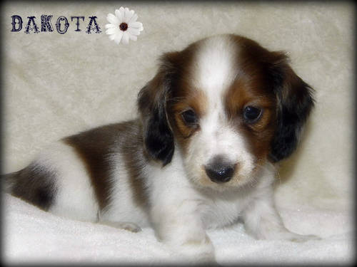 Here is a picture of Howie at about 7 weeks. He will be 9 weeks on April 14. It says "Dakota" in the corner because that's what his owner named him in the beginning. I like "Dakota" but there are too many syllables. I like two syllable names because you can yell or call them easier. "HOW-IE, come over here now!" is better than "DA-KO-TA, come over here now!" It takes too much time to yell the three syllables. And now I'm drifting off into a subject I'm not well versed in because I hated English Grammar in school, so let's just get back on track. Here's his picture: